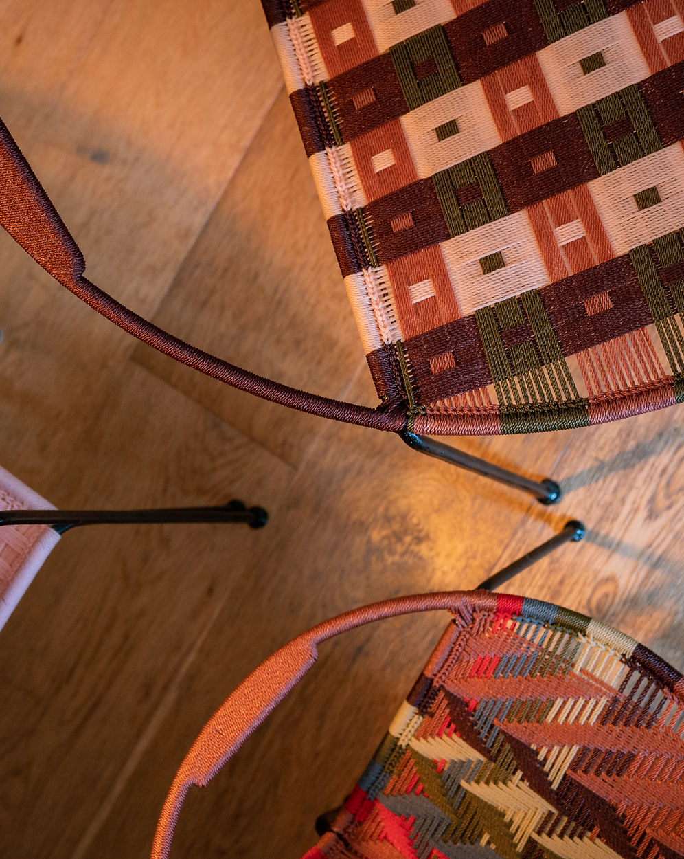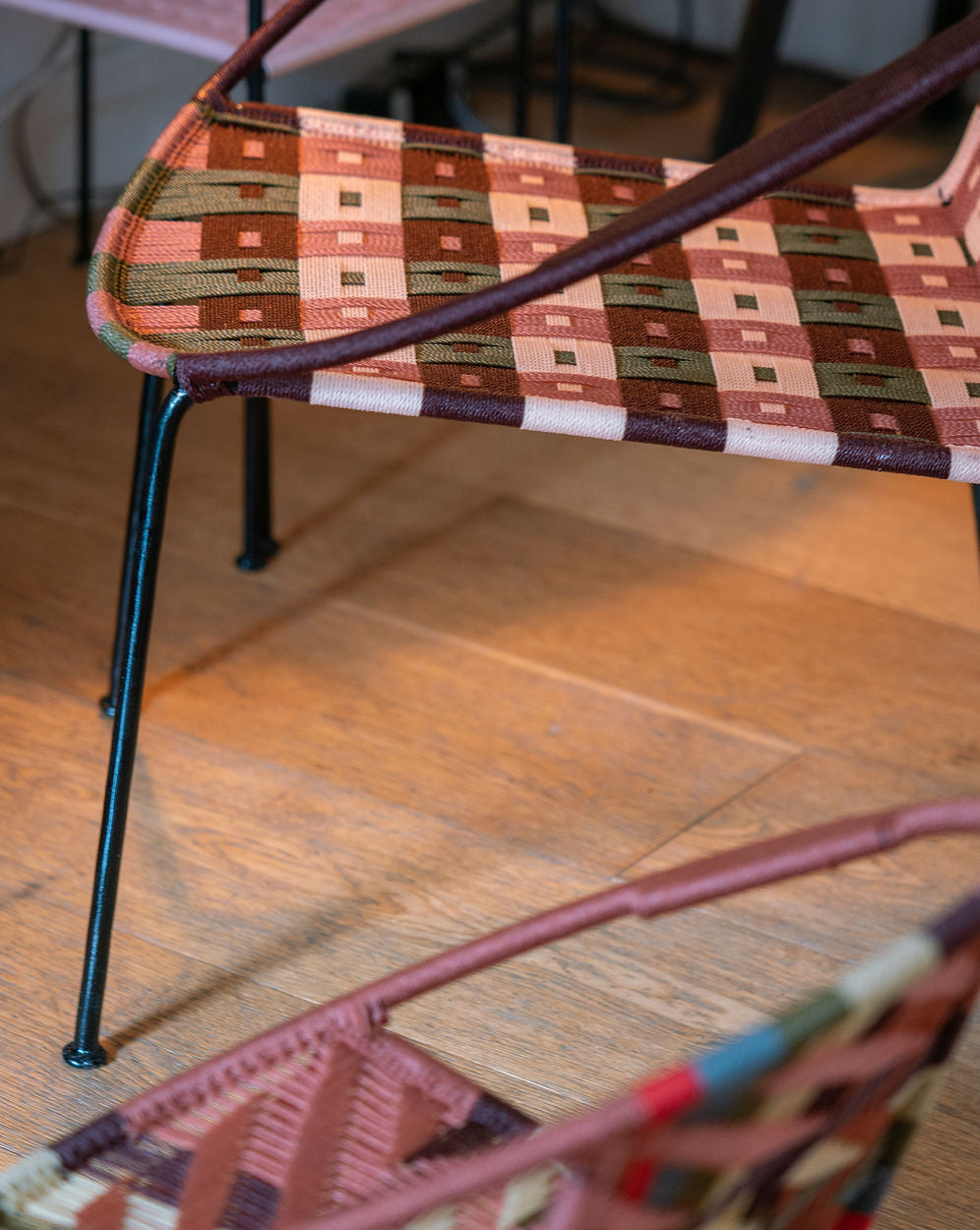 Består af svejset og håndsamlet armeringsramme, malet sort og behandlet med rustbeskyttelse, og håndflettet polypropylen fiskesnøre, gennemfarvet, fremstillet i værksted i Lomé, Togo. Hvert møbel er derfor unikt.