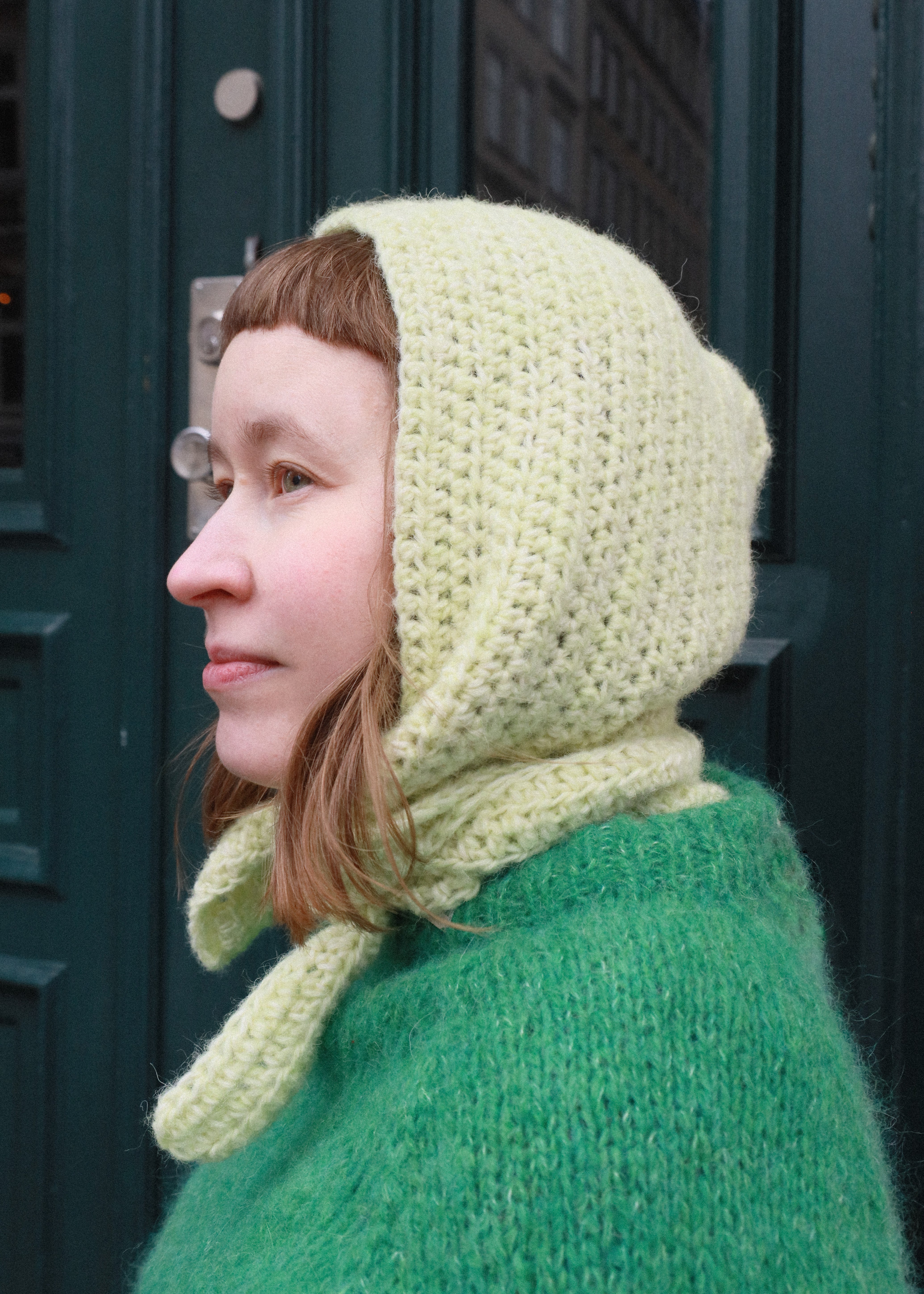 Lækker hætte i forårsfrisk farve med lange bindebånd, som både kan bindes i sløjfe eller rundt om halsen for ekstra varme.