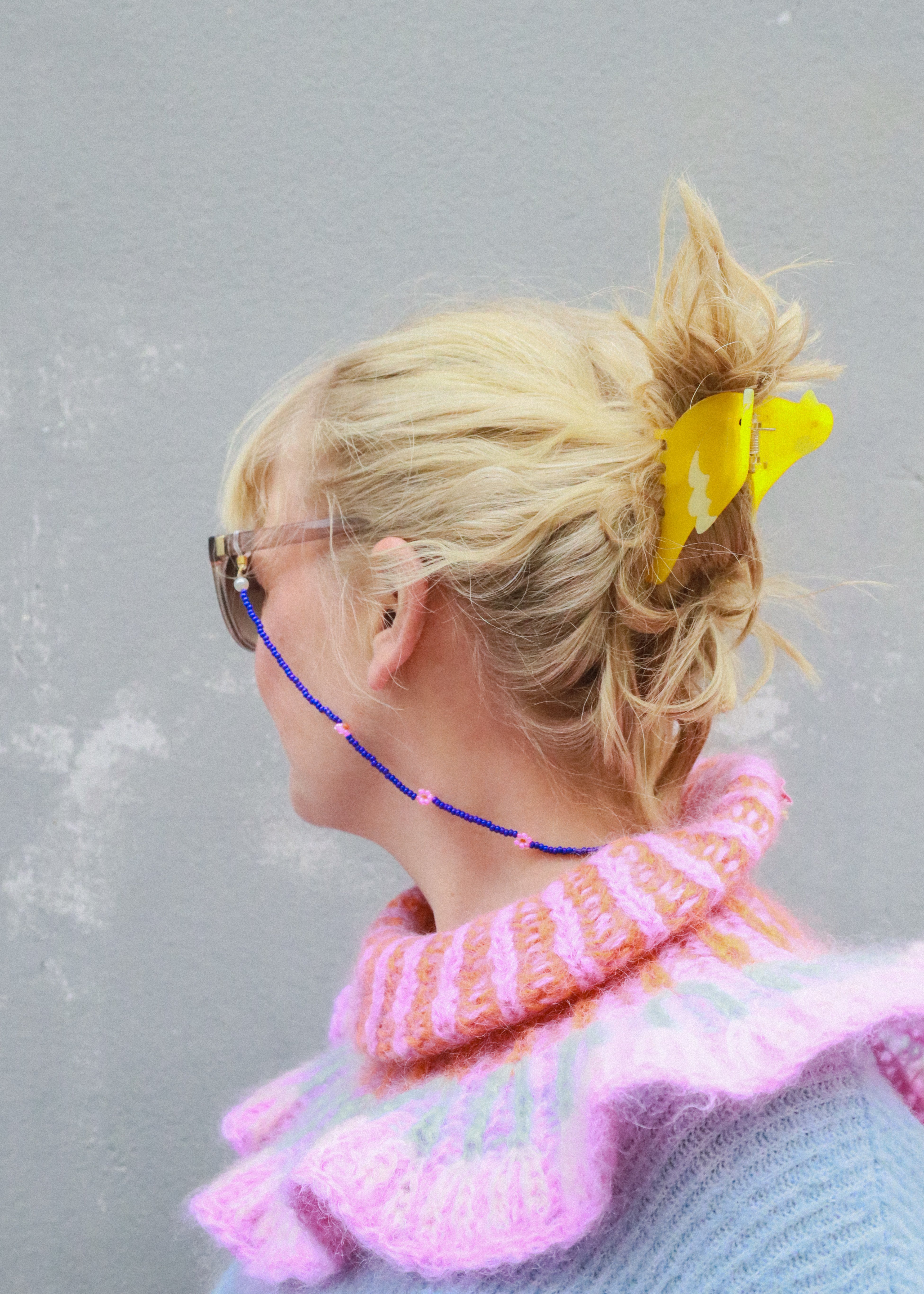 Håndlavet mørkeblå brillesnor eller -kæde i perler med pink og orange perleblomster.