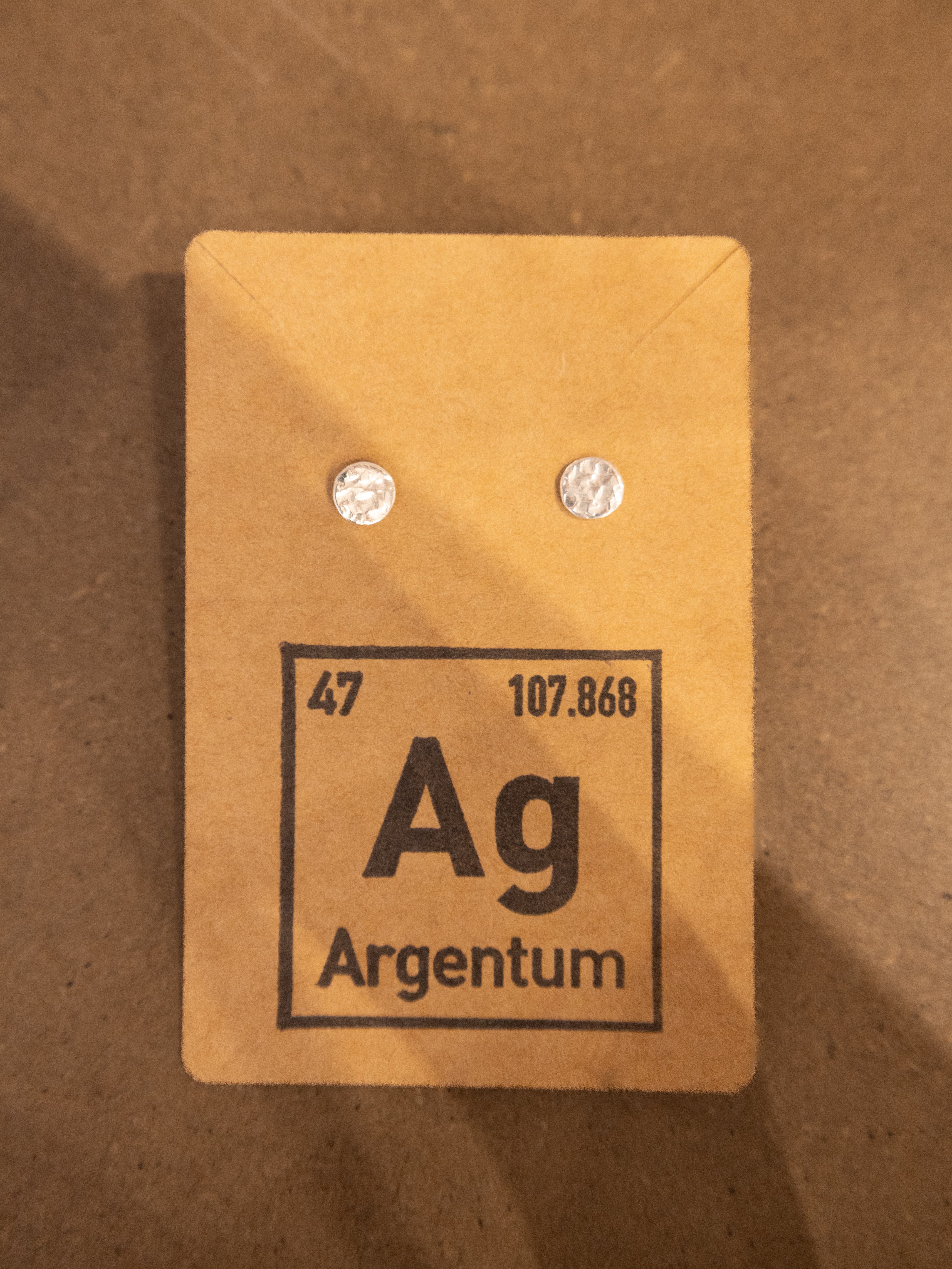 Unika sølvøreringe/stikker med hammerslået plader af sølv. Selve pladen måler ca. 7 mm i diameter.