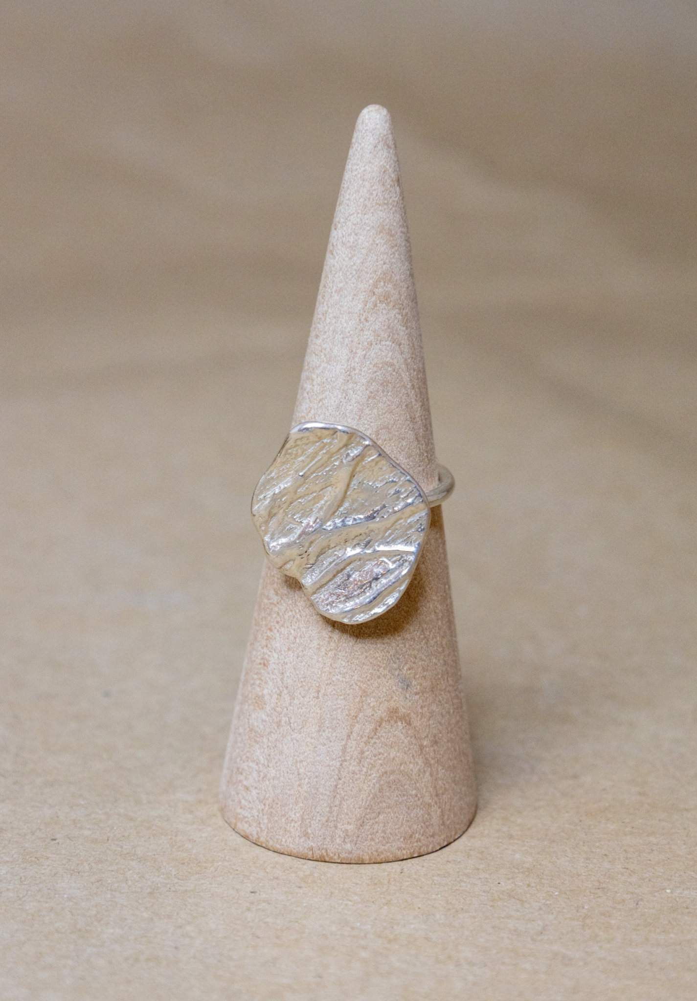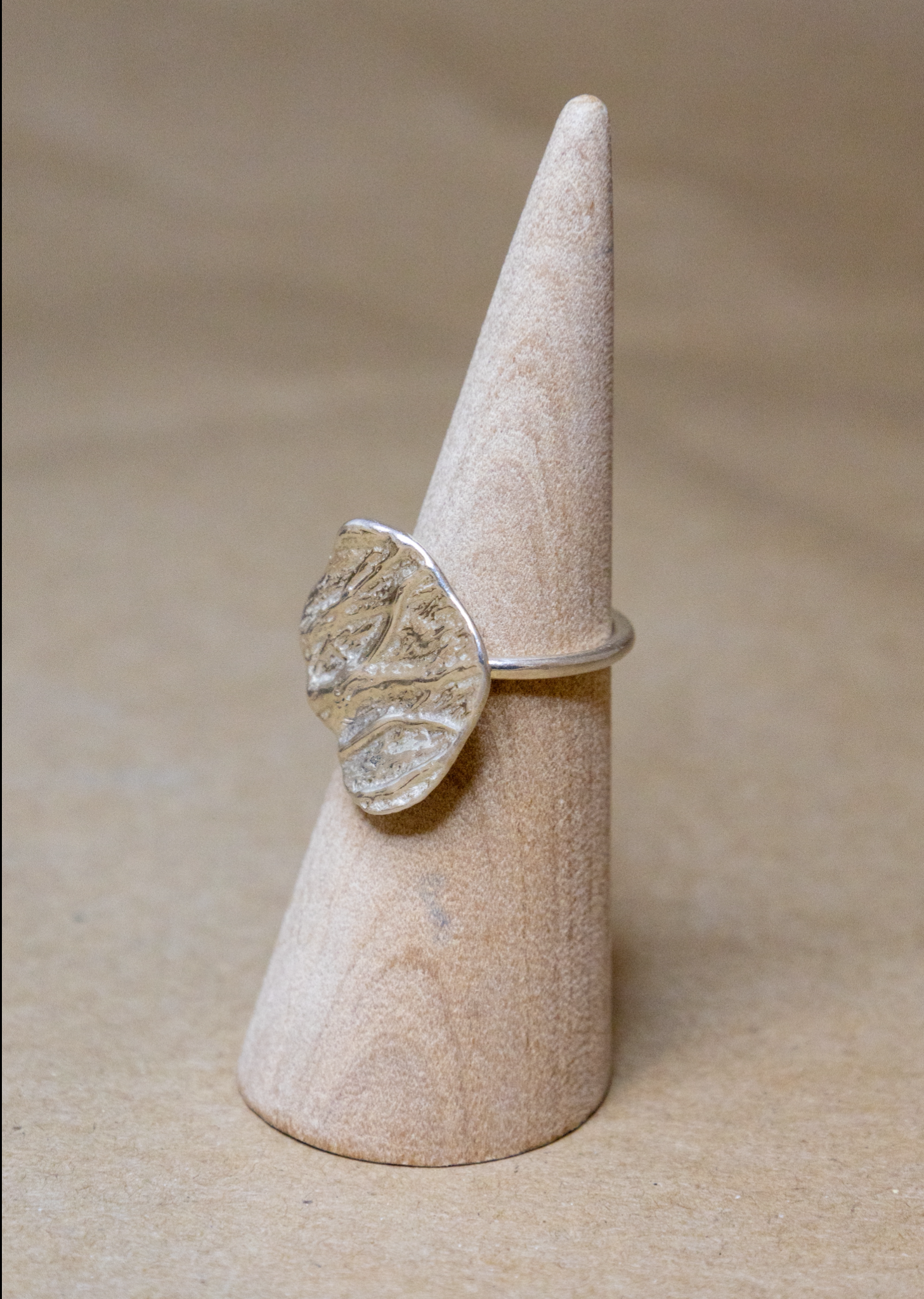 Unika sølvring med sølvplade støbt i kul med aftryk af byens asfalt.