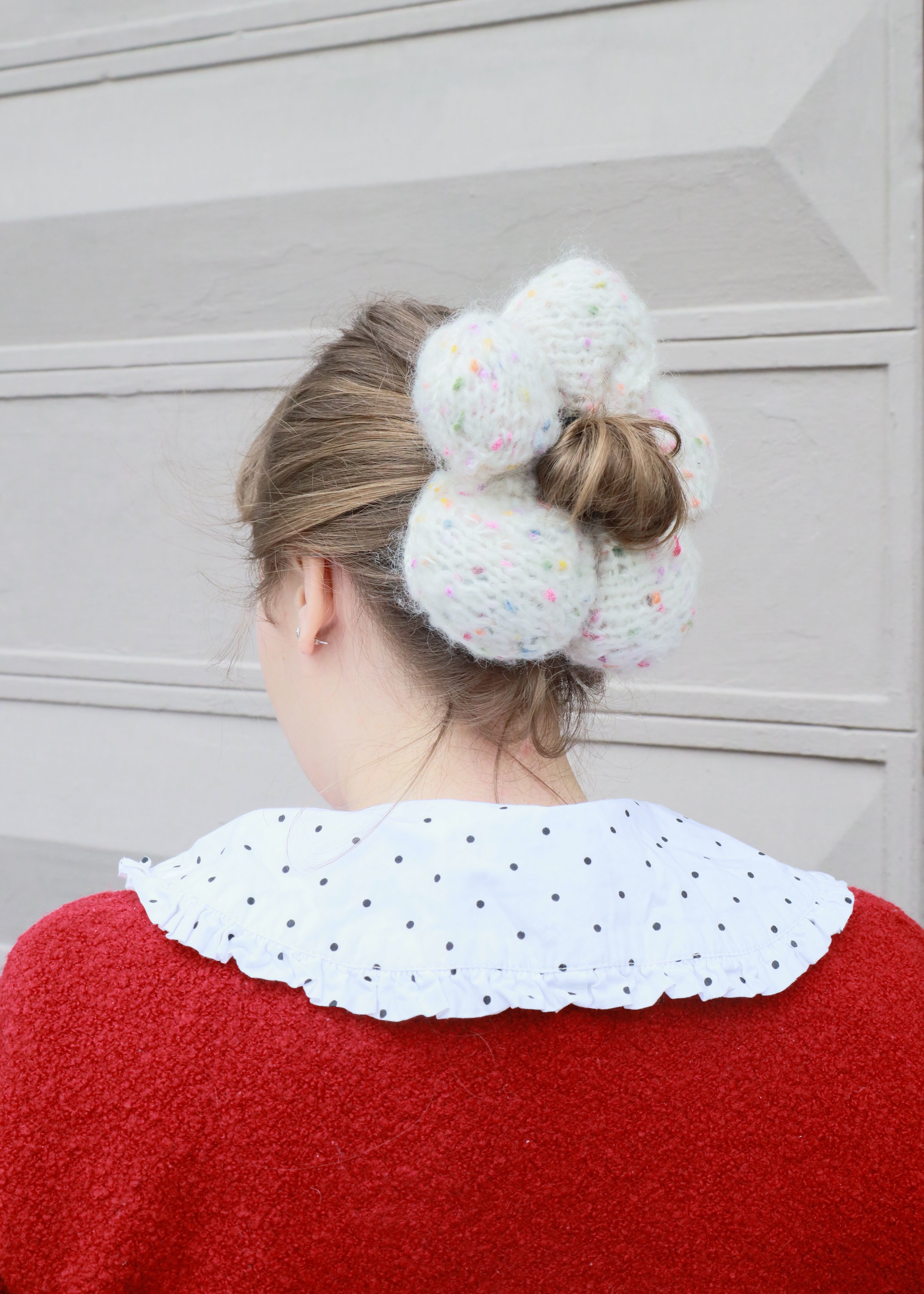 Håndstrikket scrunchie / hår elastik formet som en blomst.