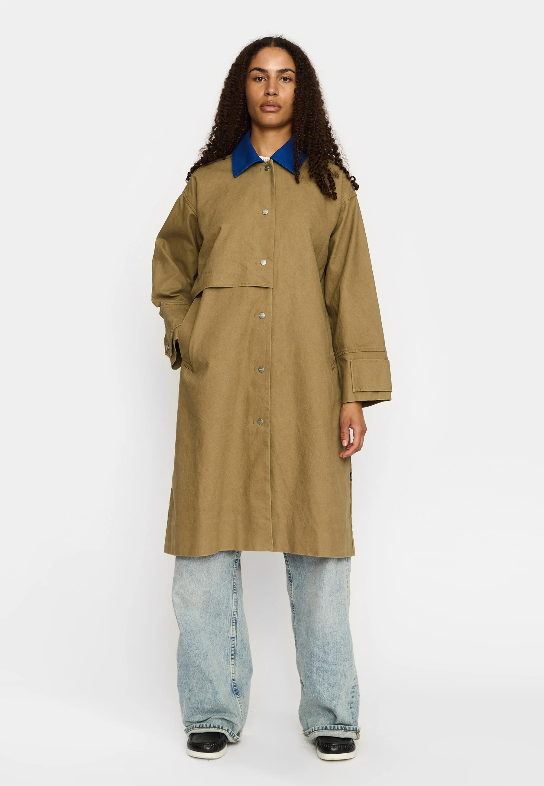 This slightly oversized coat with trench-coat-inspired details has an eye-catching contrast collar and is crafted in heavy cotton oxford fabric. The coat is without lining, with contrast bindings on the seams inside and it is designed with chunky angled duo welt pockets, and a storm flap front and back. The coat has a metal snap-button-closure and chunky buttoned cuff straps. The slit on the backside is closed with hidden snap-buttons, which can be opened if more flexibility is needed.
