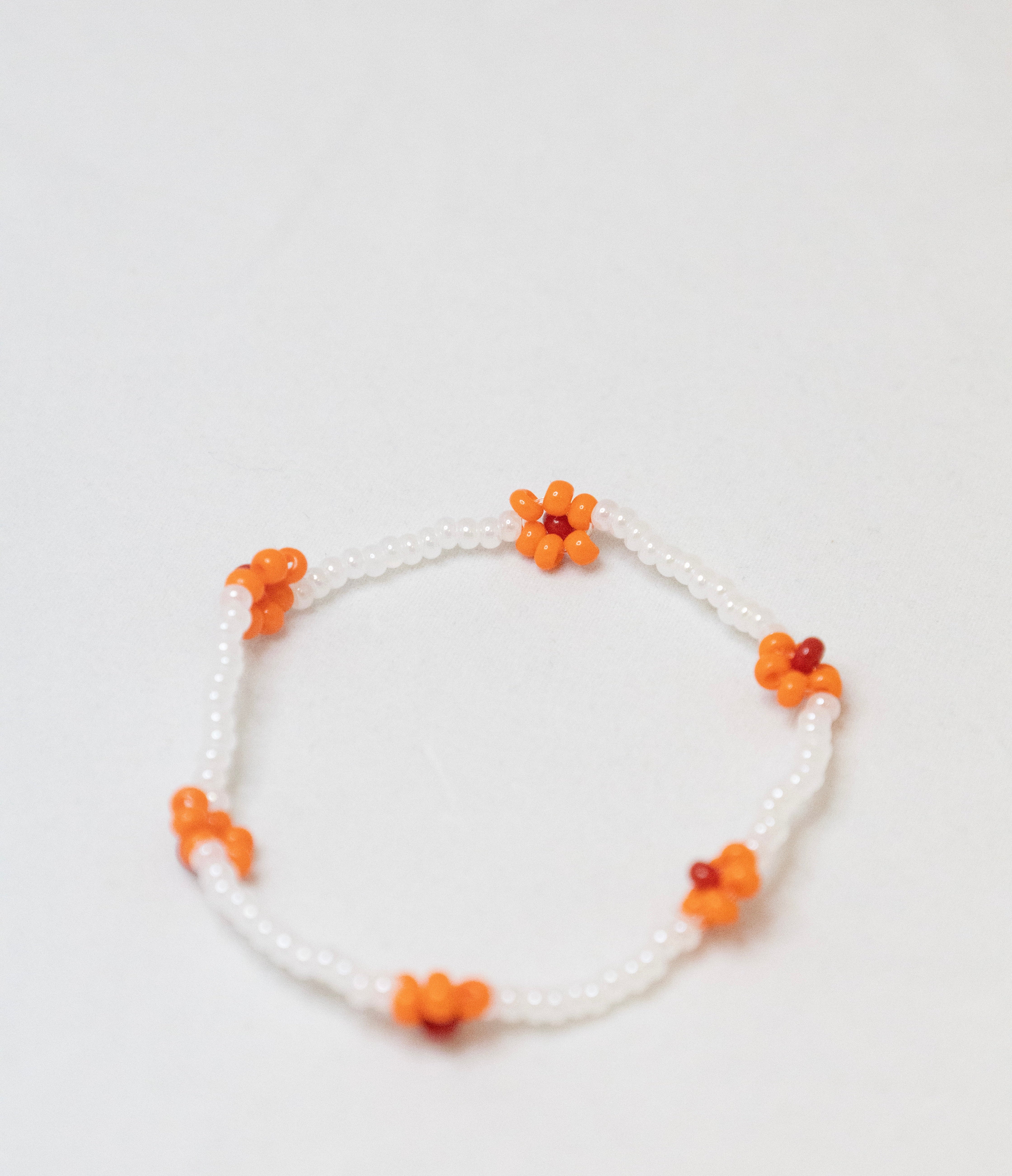 Håndlavet hvidt perlearmbånd med orange og røde perleblomster.