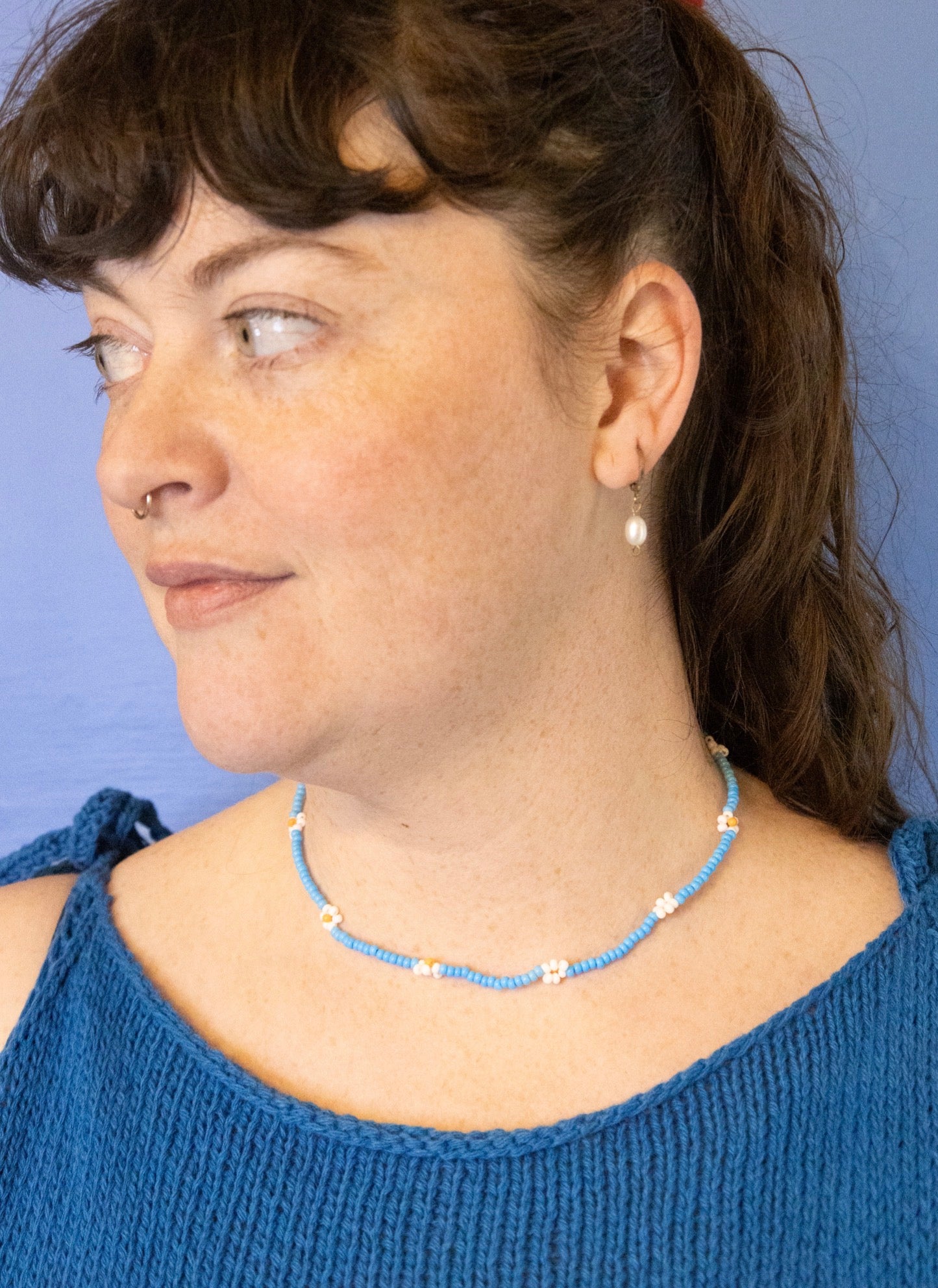 Håndlavet lyseblå halskæde i perler med hvide og orange perleblomster.
