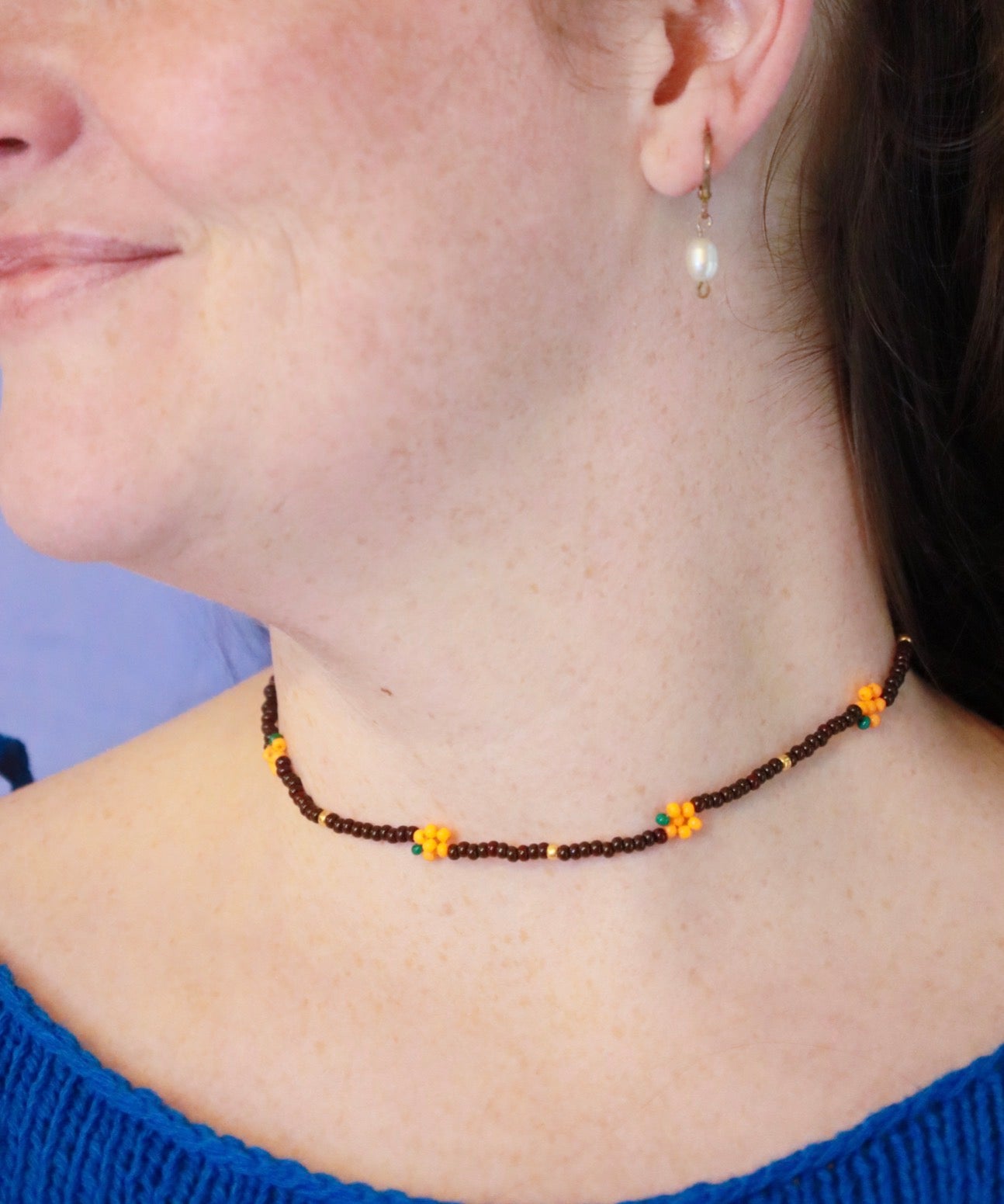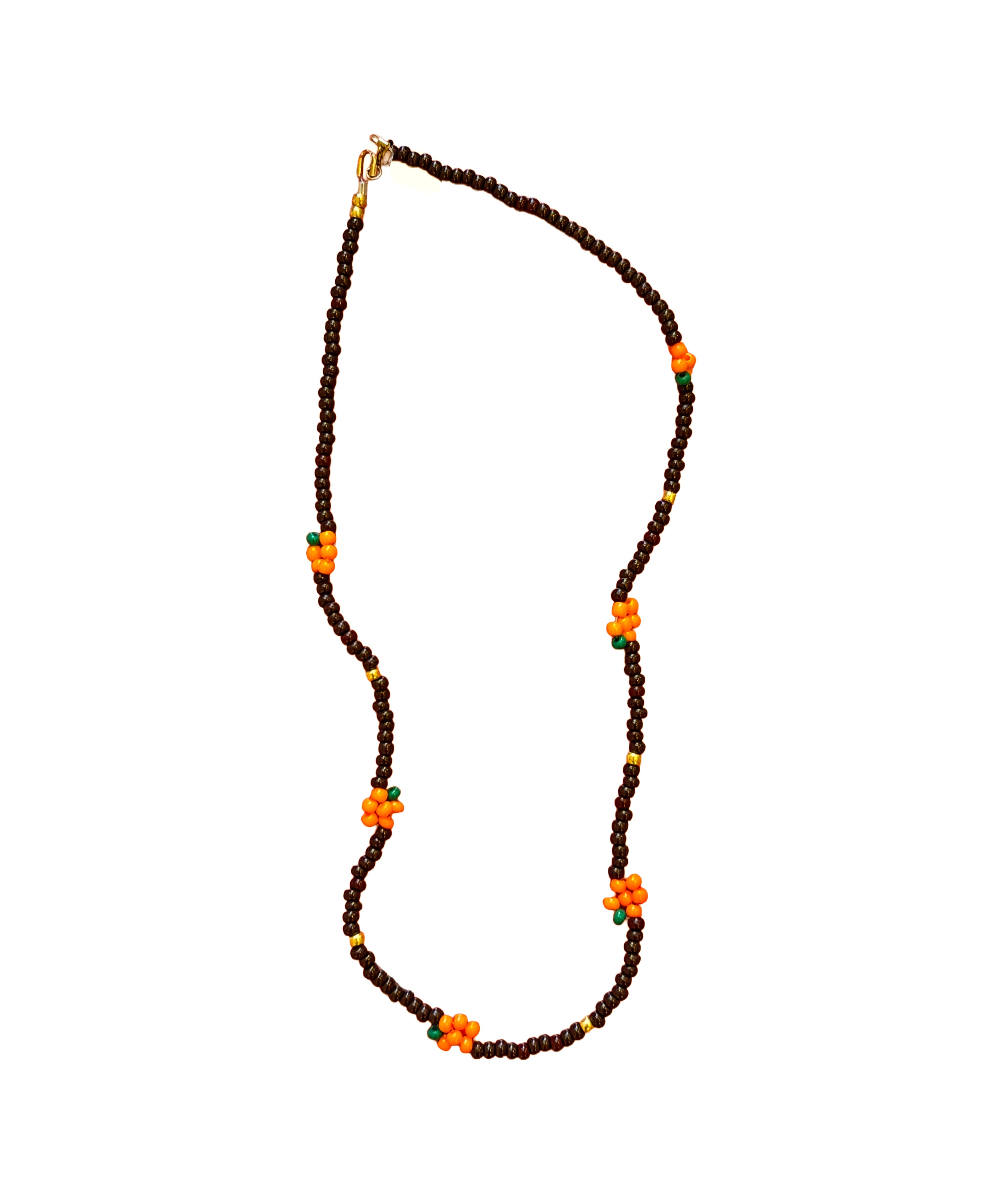 Håndlavet halskæde i perler med brune og guldfarvede perler i snoren og små orange græskar med grønt blad .