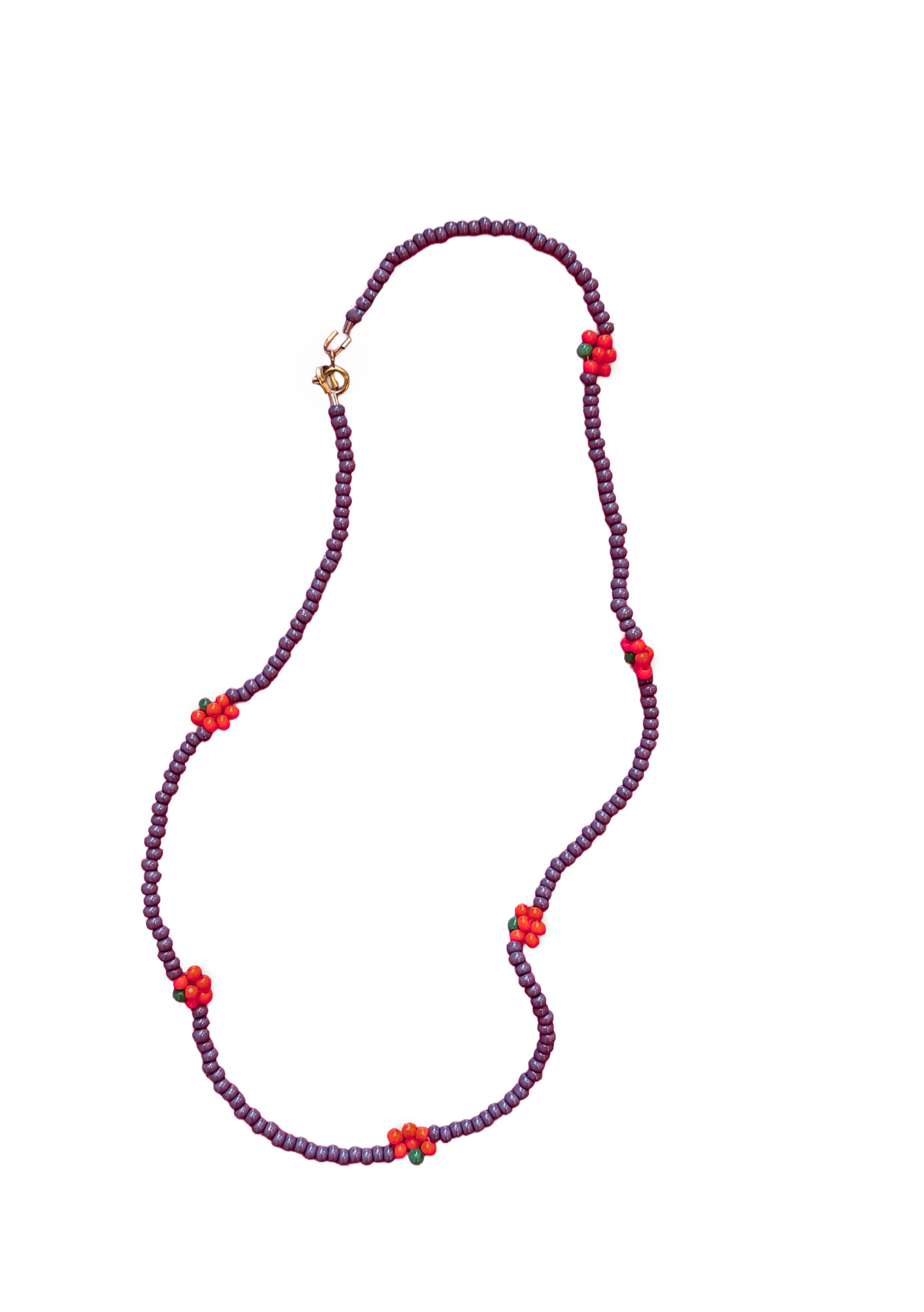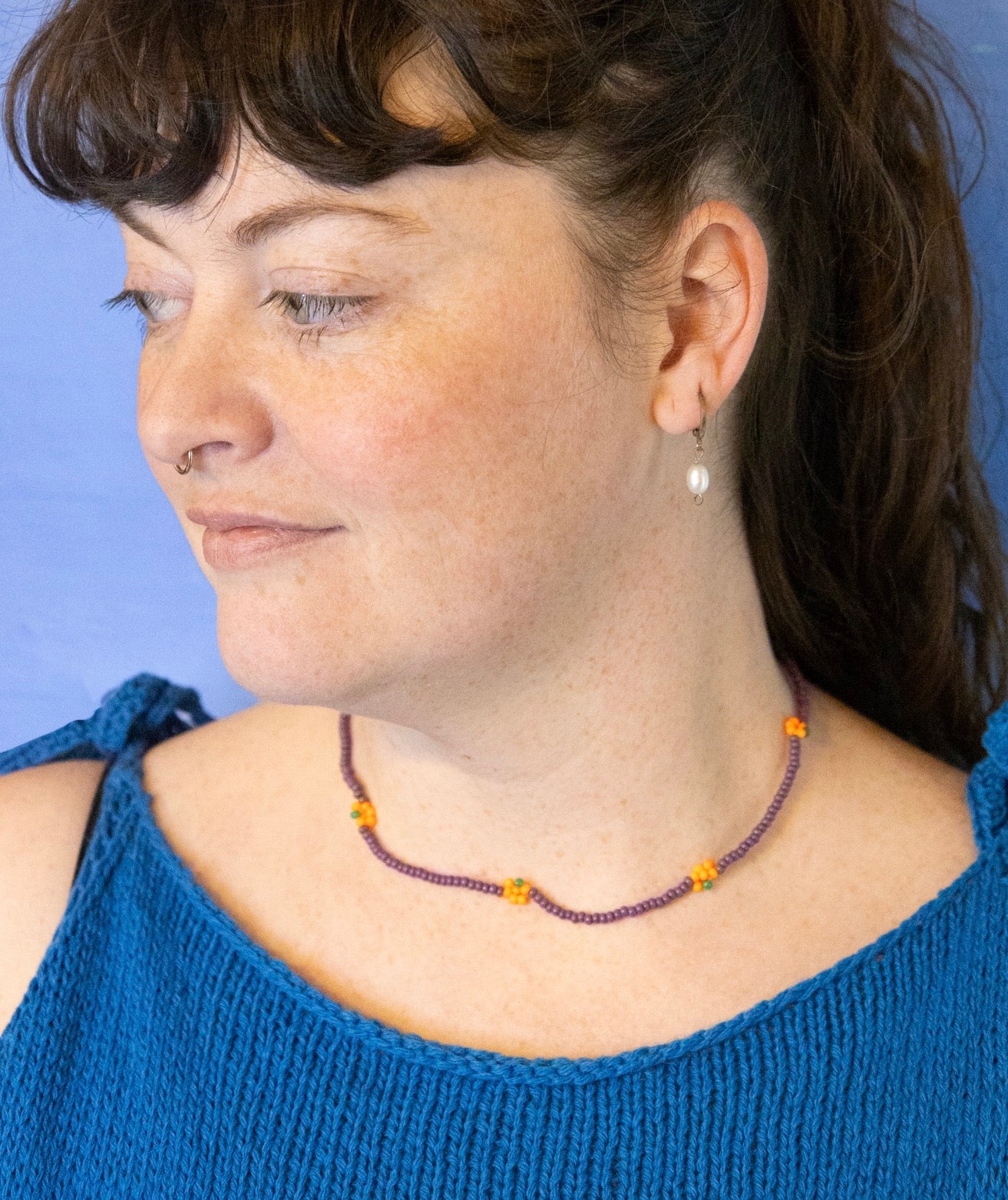 Håndlavet mørkelila halskæde i perler med orange og grøn perleblomster.