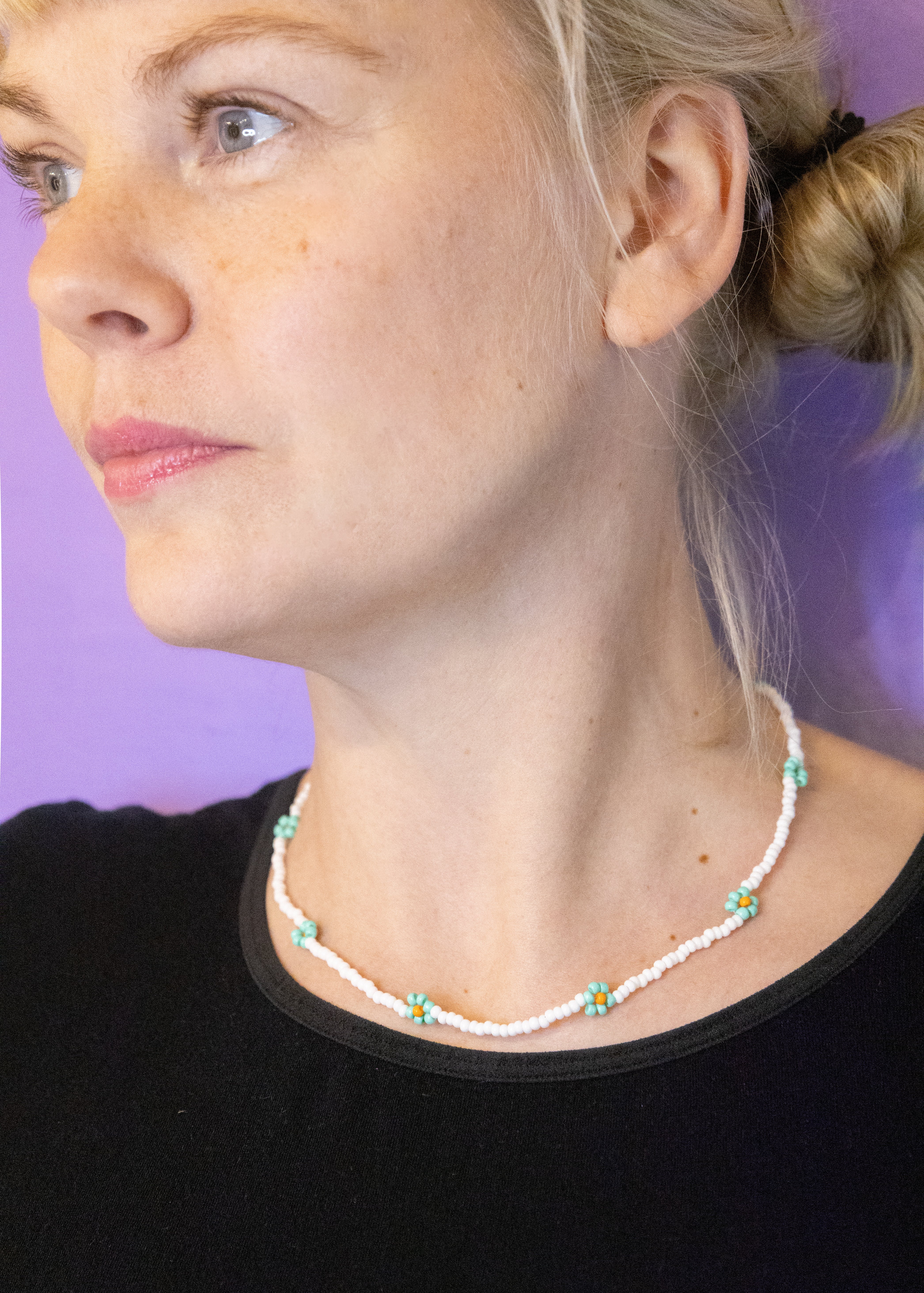 Håndlavet hvid halskæde i perler med myntegrøn og orange perleblomster.