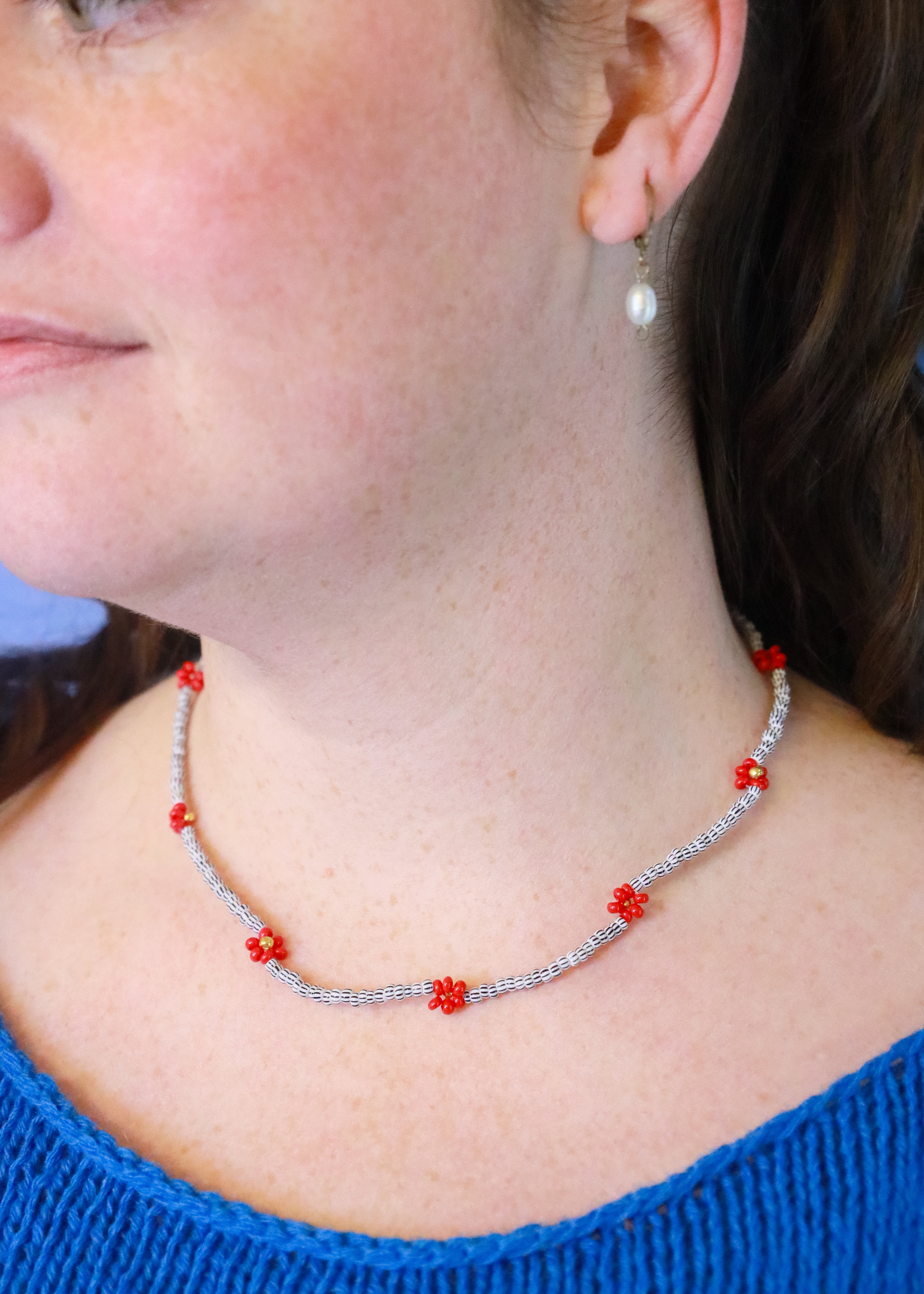 Håndlavet sort/hvid halskæde i perler med røde og guld perleblomster.
