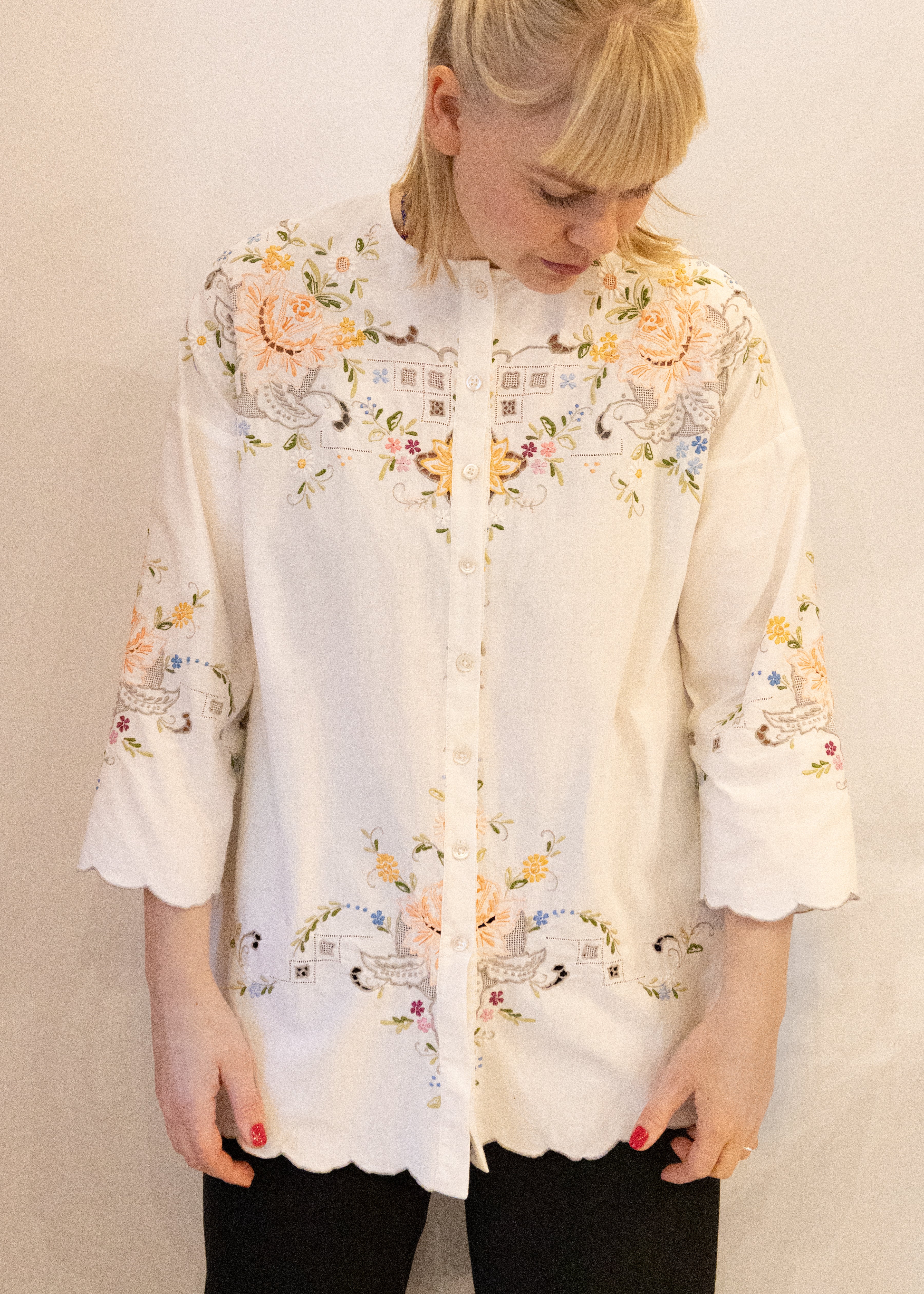 Smuk hvid skjorte med lange ærmer og lyserøde broderede blomstermotiver.