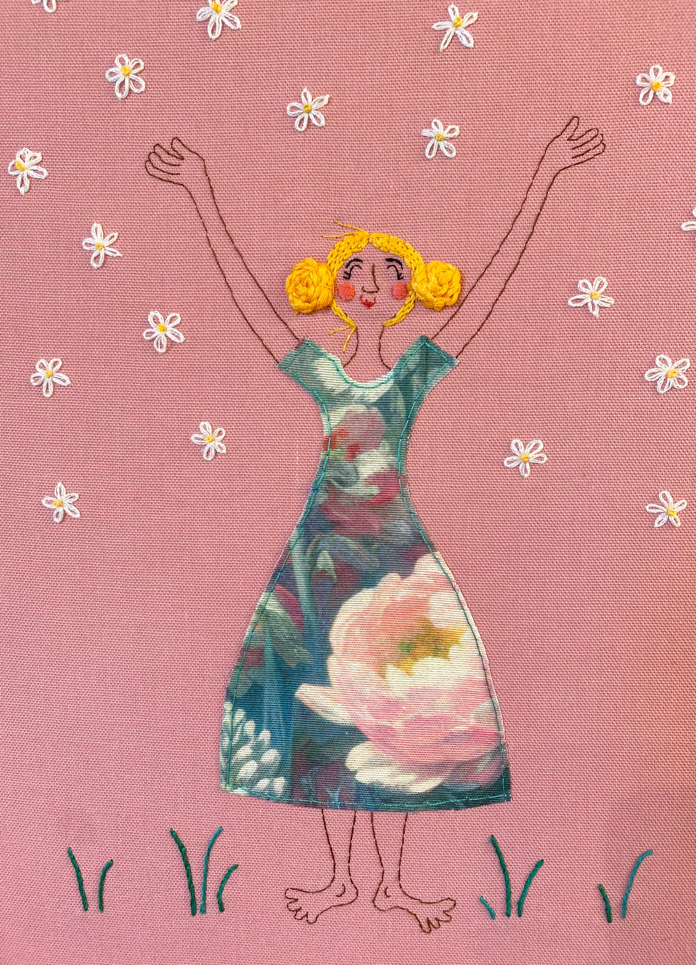 Pi Vielsted is an illustrator, graphic designer and craft maker who creates hand embroidered illustrations in her own design. Inspired by children's books from the 1950-60s and the Scandinavian design tradition, she depicts warm hearted and recognizable everyday situations that put a smile on your face. Her images are simple and graphic in their expression, with whimsical and colourful details. They are hand stitched with a mix of embroidery techniques and different yarns to create at once both a tactile and original expression.