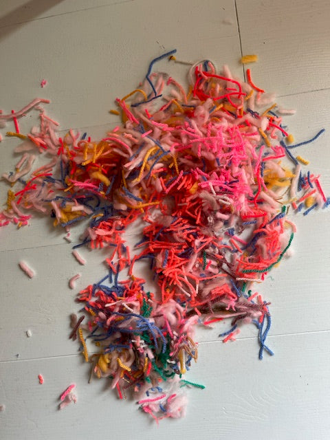 Håndlavet tuft i uld- og akrylgarn til ophæng på væggen med bagside af filt.