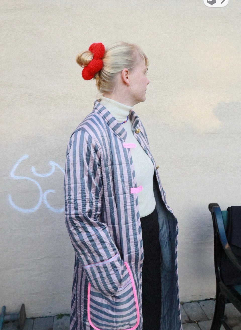 Lang stribet frakke syet i fint satinglignende stof og med to store lommer foran.