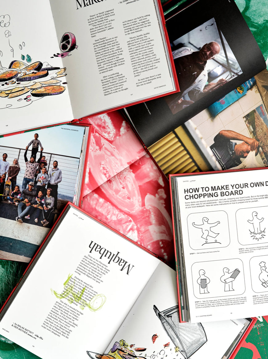 Denne kogebog med palæstinensisk køkken indeholder opskrifter som traditionel arabisk kaffe og verdens bedste falafel, sammen med historier fra lokale skatere og kendiskokke. Hver opskrift er illustreret og farvelagt af de børn, der kommer til SkatePals gratis træningssessioner, og fotograferet af frivillige fra organisationen.