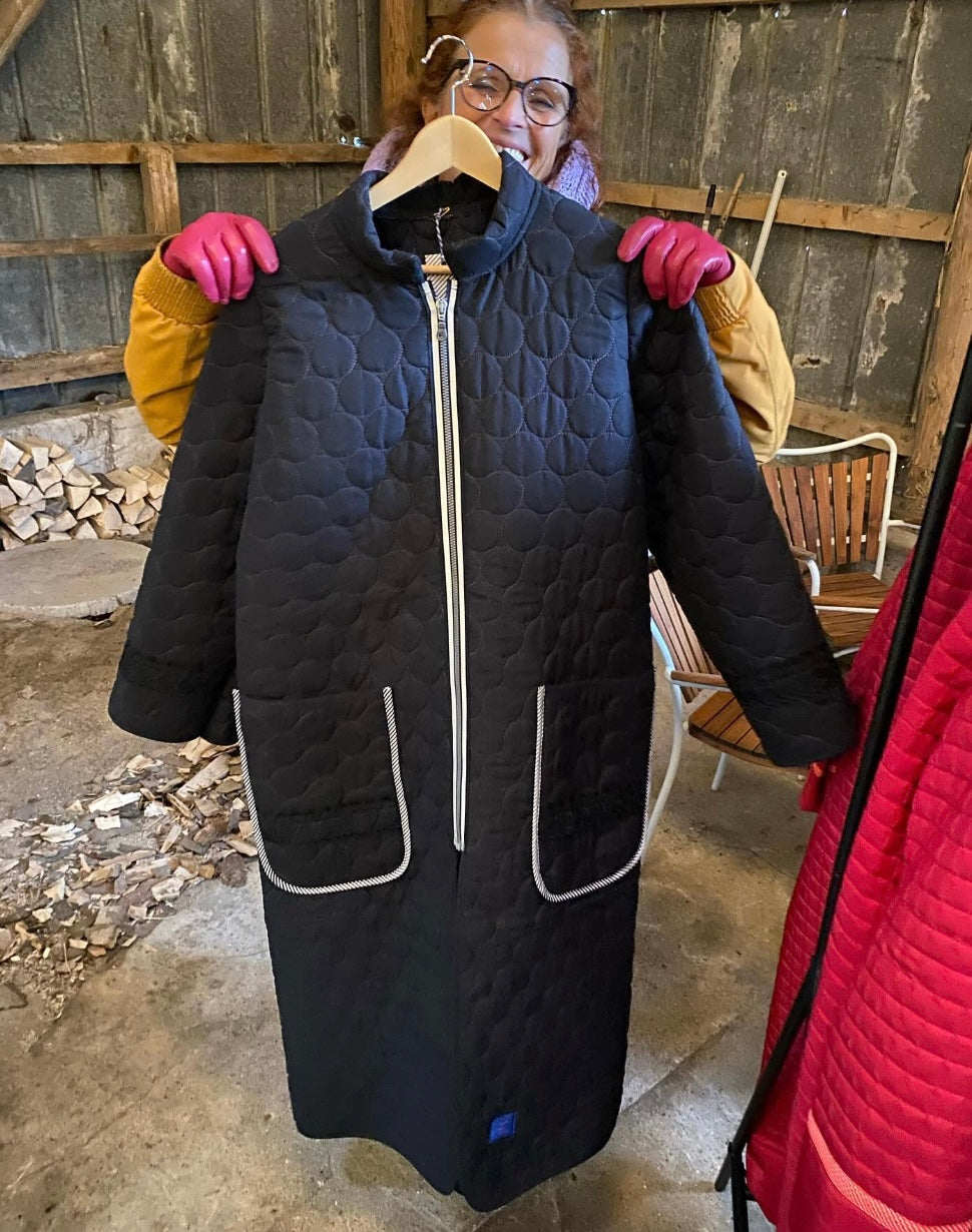 Lang sort frakke syet i fint vatteret stof og med lynlås og refleksstribe ned foran.