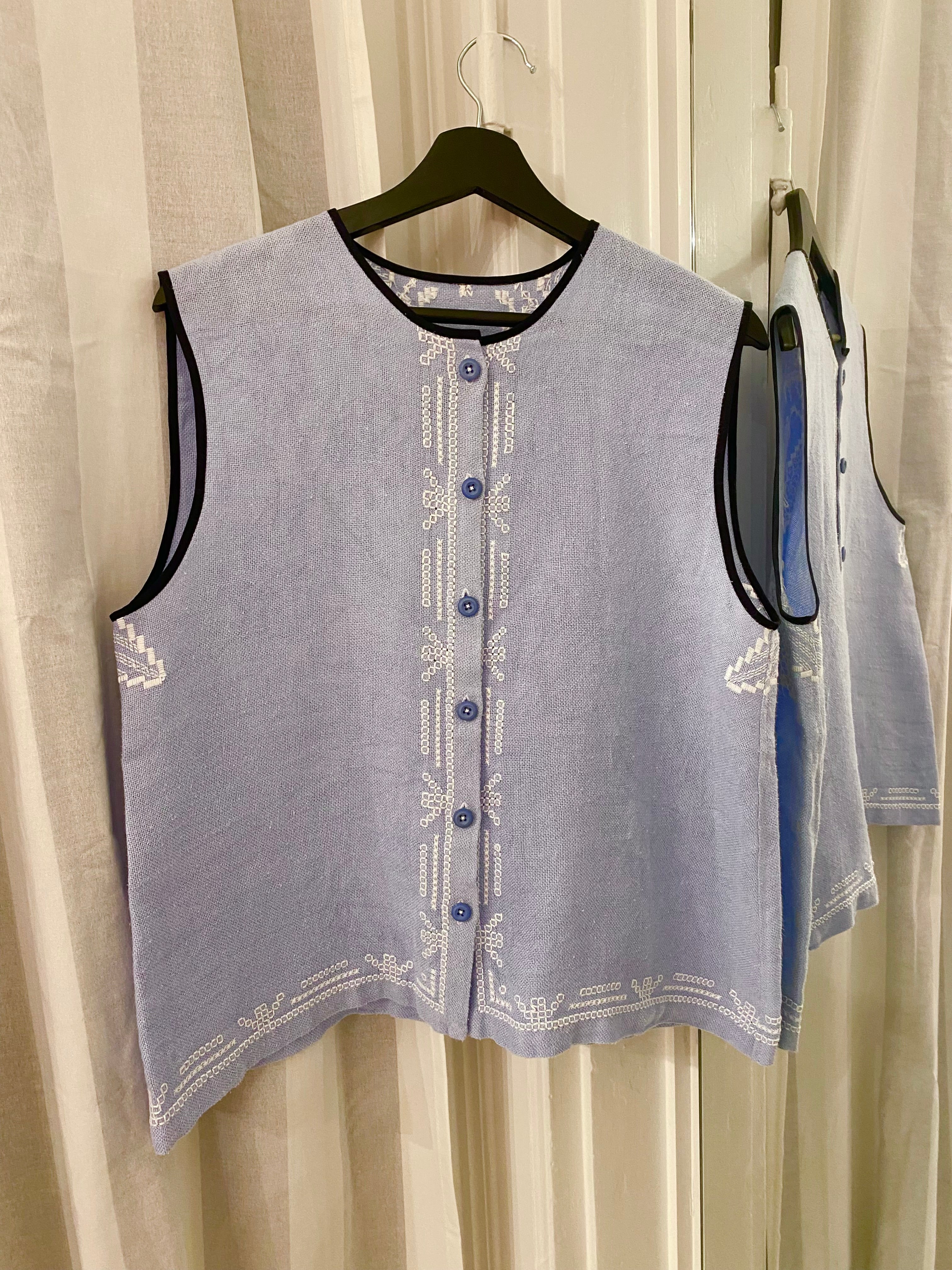 Smuk lyseblå vest med hvide broderier og lyseblå knapper.
