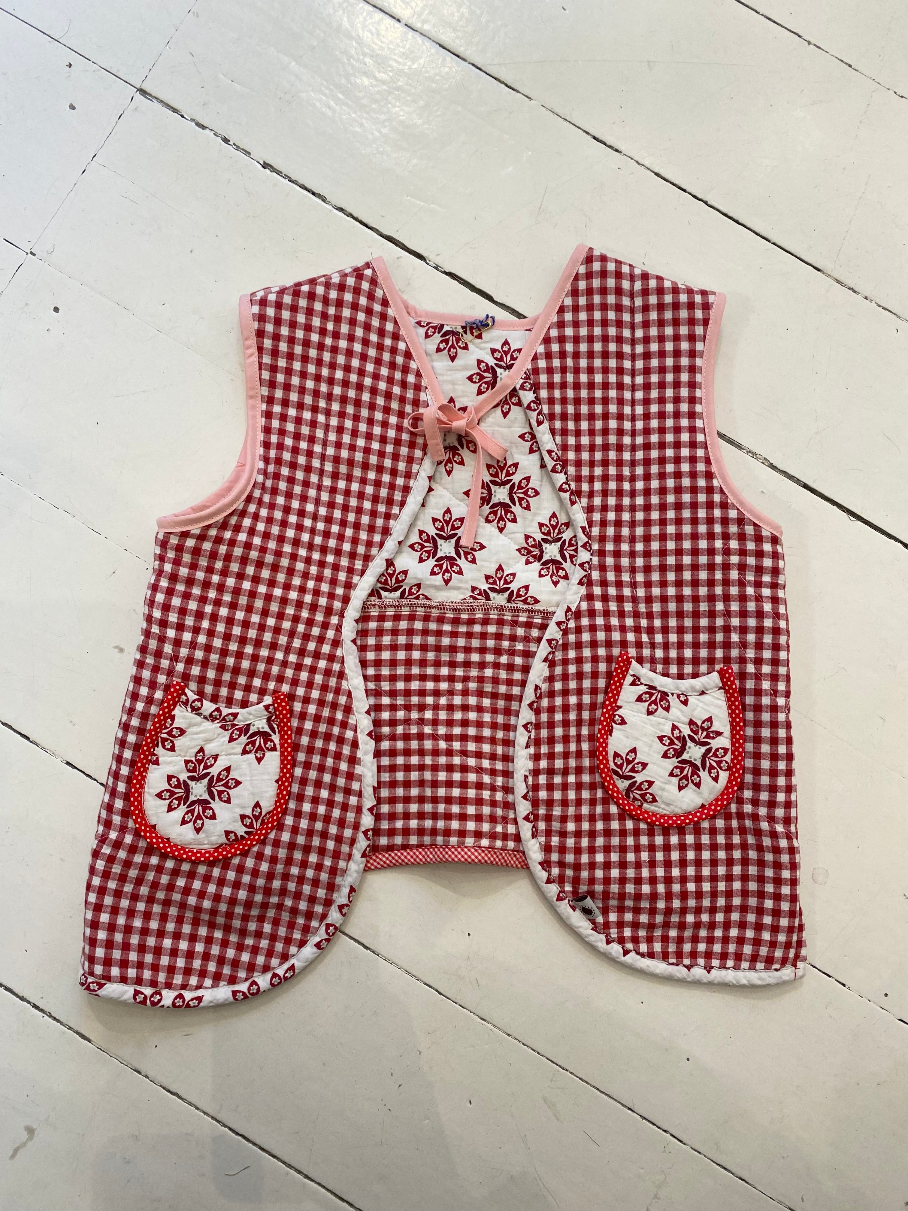 Kort quiltet vest i rød-hvide farver med tern og små blomster. 🌻