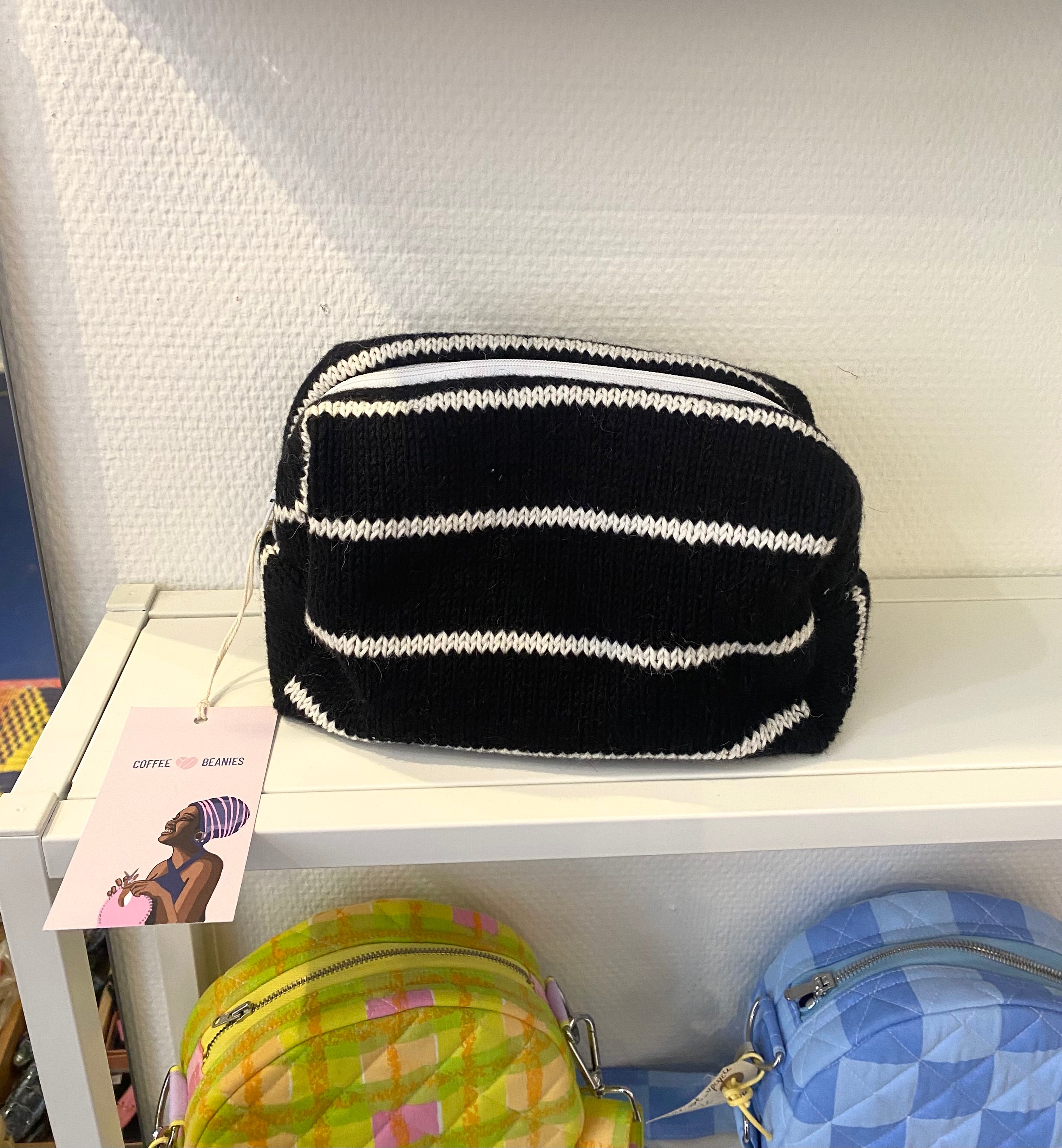 Håndstrikket toilettaske i smuk sort med hvide striber.
